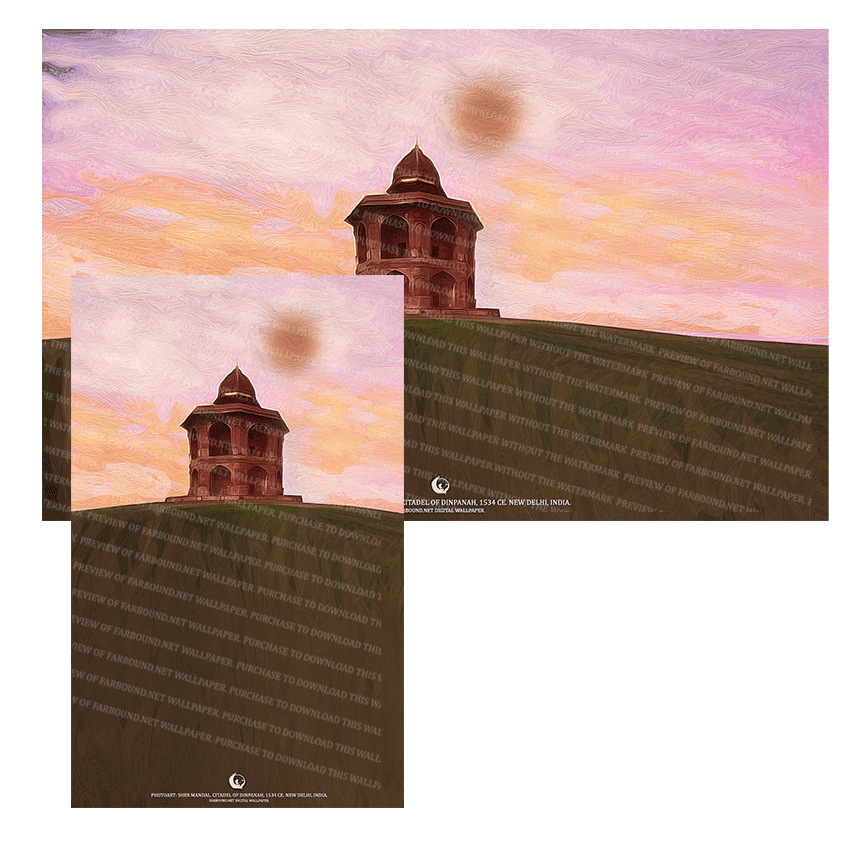 History: This Digital Wallpaper/Desktop Wallpaper/Desktop Background/Laptop Wallpaper/Mobile Phone Wallpaper/Mughal Architecture Wallpaper/Dinpanah Wallpaper, features a photoart presentation of the Sher Mandal. The Sher Mandal is a two storied tower located within the citadel of Dinpanah. It once housed a library inside and it was here the Gurkani (Mughal) emperor Humayun met his end with a tumble down the staircase. To know more visit the Farbound.Net story: Was the emperor Humayun murdered?