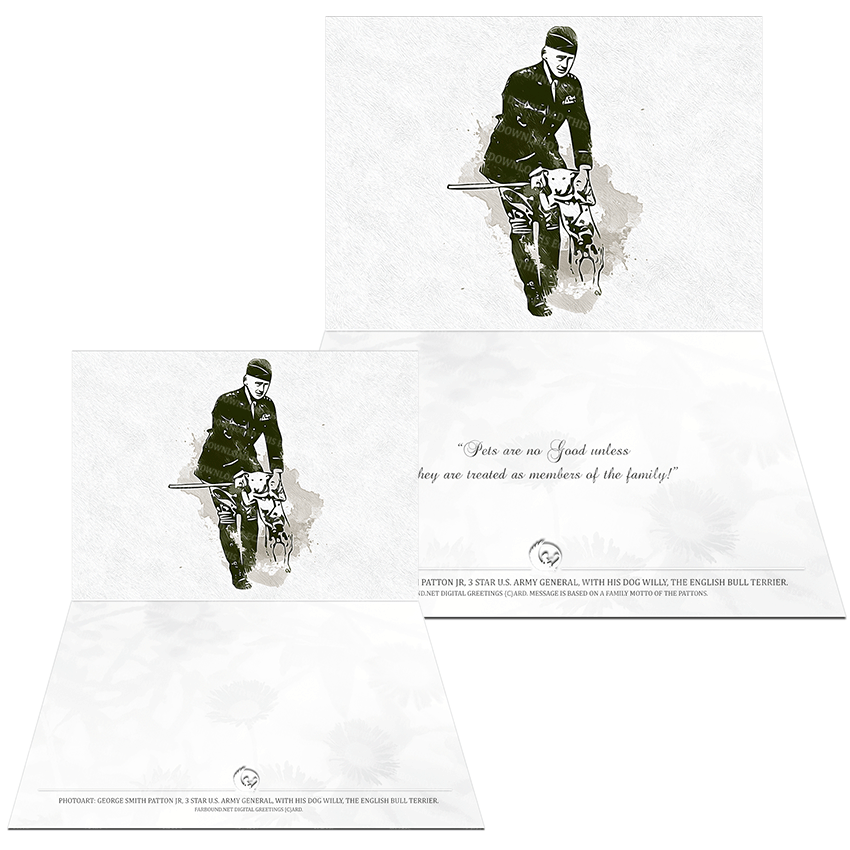 History: This Greetings Card for Dog Lovers features a photoart representation of George Smith Patton Jr. Born on the 11th of November in 1885 Ad., George Patton was a 3-Star General of the U.S. Army, who served with distinction in World War II. The Greetings Card also features a photoart presentation of Willy, Patton's English Bull Terrier.