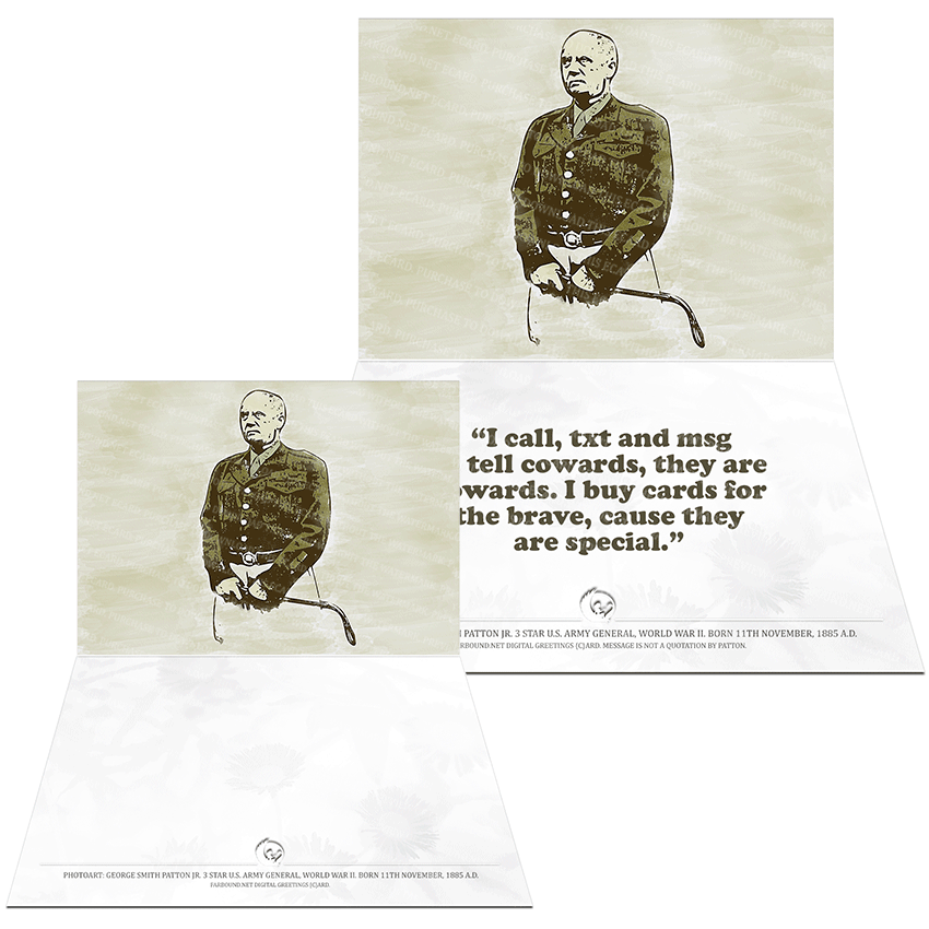 History: This Greetings Card/Compliments Card for expressing admiration and complimenting someone for bravery, features a photoart presentation of George Smith Patton Jr. Born on the 11th of November in 1885 Ad., George Patton was a 3-Star General of the U.S. Army, who served with distinction in World War II.