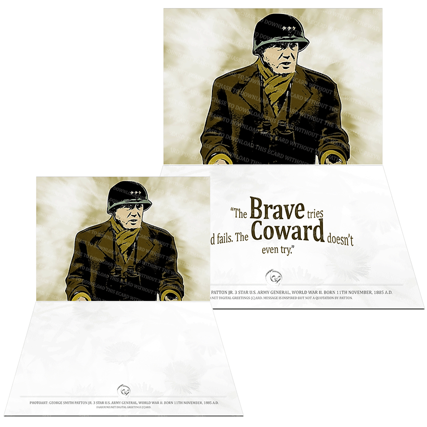 History: This Greetings Card/Motivational Card/Encouragement Card/Inspirational Card for commemorating historical people and inspiring friends and loved ones with a motivating message to be brave, features a photoart presentation of George Smith Patton Jr. Born on the 11th of November in 1885 Ad, George Patton was a 3-Star General of the U.S. Army, who served with distinction in World War II.