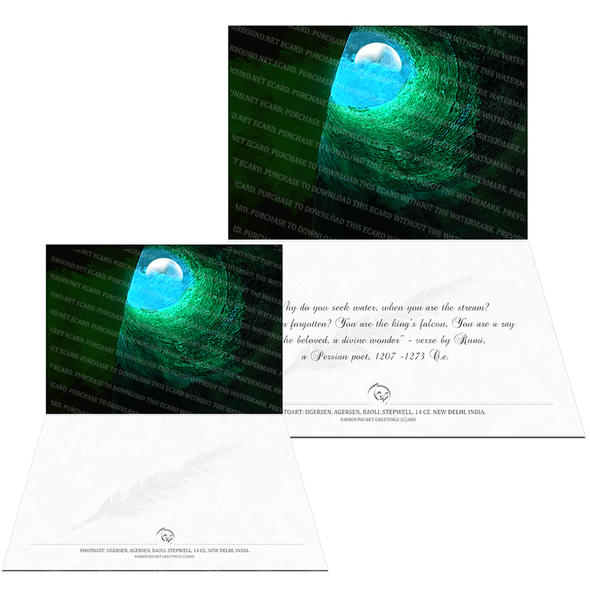 History: This Greetings Card with a verse from the quill of Rumi (a Persian poet of Sufi and mysticism, 12 Ce), features a photoart presentation of a dried up water conduit at the Ugersen Baoli. Also known as the Agersen Baoli, this step well is thought to have been first built in the 11 Ce, and later rebuilt in a more elaborate manner in 14 Ce. To know more, see the Farbound.Net snippet: Delhi's underground summer retreat.