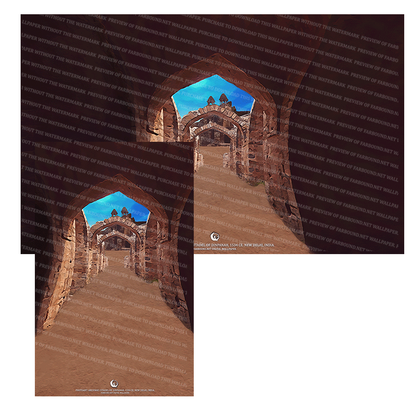 History: This Digital Wallpaper/Desktop Wallpaper/Desktop Background/Laptop Wallpaper/Mobile Phone Wallpaper/Mughal Architecture Wallpaper/Medieval Architecture Wallpaper/Dinpanah Wallpaper, features a photoart presentation of a gateway of the citadel of Dinpanah. Founded in 1534 Ce, by Gurkani (Mughal) Naseer-ud-din Muhammad Humayun, Dinpanah was the 6th city of Delhi and a testament to the scholarly Humayun's policy of imperial tolerance for all regions. To know more see the Farbound.Net story: Dinpanah, the city of Humayun.