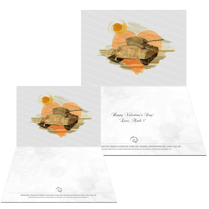 History: This Greetings Card/Valentine's Day Card features, a photoart presentation of a photo of a Valentine Mark III Infantry tank. A vintage war tank from World War II, the Valentine first produced in 1938 Ad and remained in service till 1960 Ad. It was manufactured by the company Vickers-Armstrongs Limited, based in the U.K. According to some sources the name Valentine was coined from Vickers and Armstrongs and was the codename of the tank. The tank on which this artistic presentation is based is on exhibit at the Imperial War Museum, U.K.