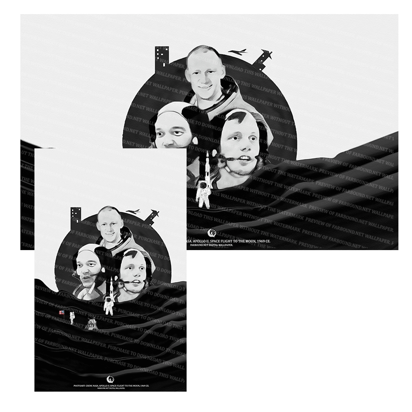 History: This Digital Wallpaper/Desktop Wallpaper/Desktop Background/Laptop Wallpaper/Mobile Phone Wallpaper/Outer Space Wallpaper for commemorating and remembering pioneers and astronauts, features a photoart presentation of Neil Armstrong, Buzz Aldrin, Michael Collins and the NASA space flight Apollo II. The Apollo II mission was the first successful space flight to the moon. The mission was launched in 1969 Ce and saw humans walk on the surface of the Moon. his digital wallpaper is part of the series, We were Pioneers and pays homage to Astronauts.