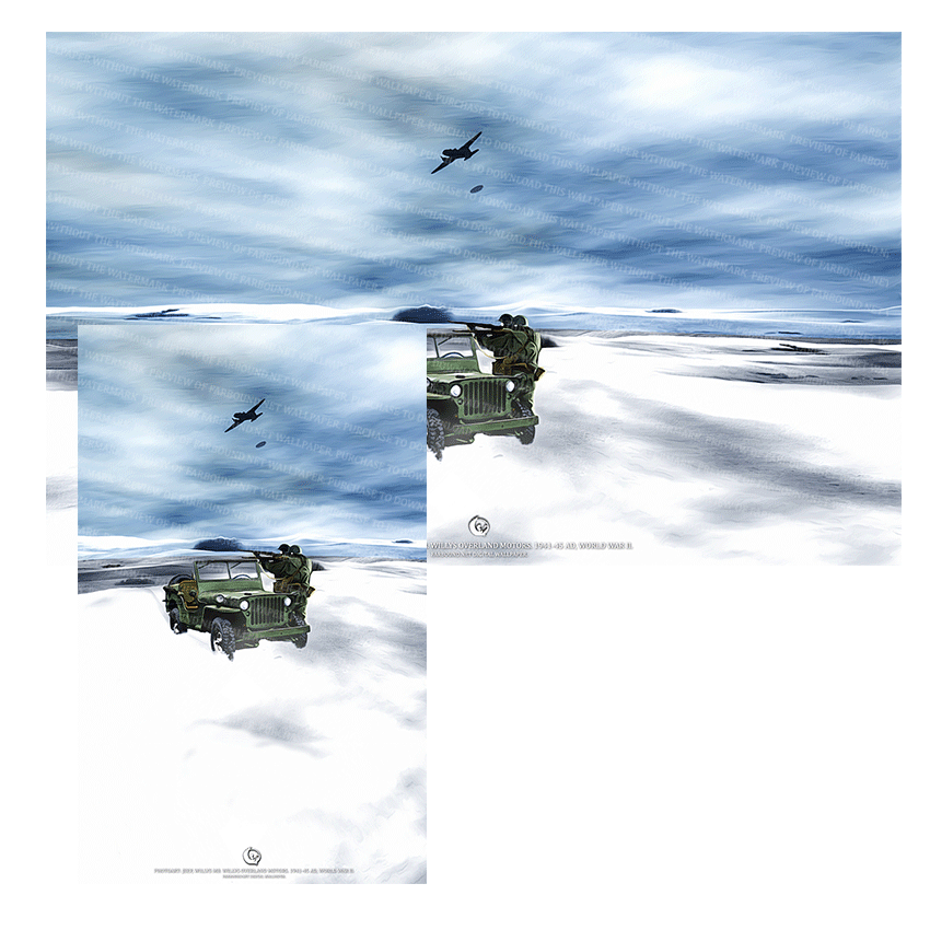 History: :This Digital Wallpaper/Desktop Wallpaper/Desktop Background/Laptop Wallpaper/Mobile Phone Wallpaper/Cars and Automobile Wallpaper/4x4s Wallpaper/World War II Automobiles Wallpaper/Jeep Wallpaper/Willys MB Wallpaper, features a photoart presentation of a Willys MB Jeep in a snow covered terrain with soldiers standing with rifles ready. The Willy's MB was a variant of the legendary Jeep line of automobiles. While the prototype of the Jeep was originally produced by the American Bantam Car Company, during World War II it was mass produced by Willys Overland Motors and the Ford Motor Company. All Jeep variants were identical and made as per U.S military specifications, barring slight differences. The variants were respectively known as the Bantam Jeep, Willys MB Jeep and Ford GPW (Jeep). All Jeep variants were also classed as light utility combat vehicles and were capable of performing diverse tasks including pulling rail carriages. However, it was Willys Overland Motors that patented the name 'Jeep' on the 7th of July, 1941 Ad. To know more, see the Farbound.Net story: Had to be a Jeep.
