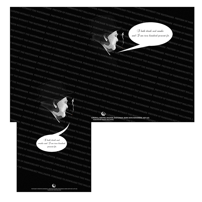 History: This Digital Wallpaper/Desktop Wallpaper/Desktop Background/Laptop Wallpaper/Mobile Phone Wallpaper/Black and White Wallpaper/Famous people Wallpaper for commemorating, honoring and remembering famous people, features a photoart presentation of Sir Winston Leonard Spencer Churchill, more popularly known as Winston Churchill. Born on the 30th of November in 1874 Ad, Winston Churchill was a writer, soldier and statesman. He served as the Prime Minister of the United Kingdom from 1942 -1945 and briefly from 1951 -1955 Ad. Winston Churchill was also awarded the Nobel prize in Literature for historical and biographical descriptions and oratory. He is remembered as Britain's greatest wartime Prime Minister. The Wallpaper also features a witty quote of Winston Churchill on Drinking and Smoking, and staying 200% fit. Historically, it was quip directed directed towards Field Marshall Montgomery, whom Winston Churchill did not like.