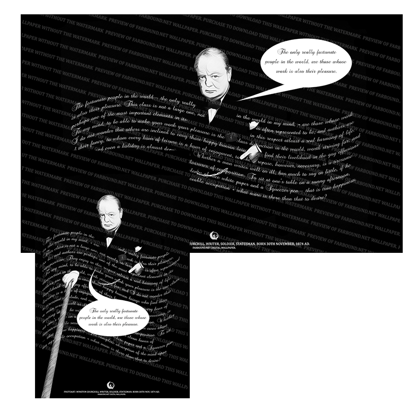 History: This Digital Wallpaper/Desktop Wallpaper/Desktop Background/Laptop Wallpaper/Mobile Phone Wallpaper/Black and White Wallpaper/Famous people Wallpaper for commemorating, honoring and remembering famous people, features a photoart presentation of Sir Winston Leonard Spencer Churchill, more popularly known as Winston Churchill. Born on the 30th of November in 1874 Ad, Winston Churchill was a writer, soldier and statesman. He served as the Prime Minister of the United Kingdom from 1942 -1945 and briefly from 1951 -1955 Ad. Winston Churchill was also awarded the Nobel prize in Literature for historical and biographical descriptions and oratory. He is remembered as Britain's greatest wartime Prime Minister. The Wallpaper also features an extract from a speech of Winston Churchill and his quote on work and pleasure.
