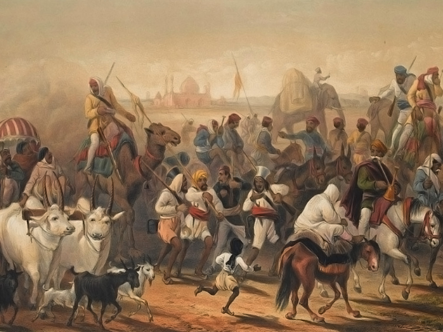 A hand-coloured lithograph from 1860 depicts a jumble of men, animals and supplies rambling across a dusty Indian landscape raising a cloud of dust at the tail end. There is also the figure of a child running amidst the confusion and the scene brings to mind professor Kalikaranjan Qanungo’s description of the chaos that prevailed when a medieval Gurkani (Mughal) army marched for war. Except, this is no Gurkani (Mughal) army.